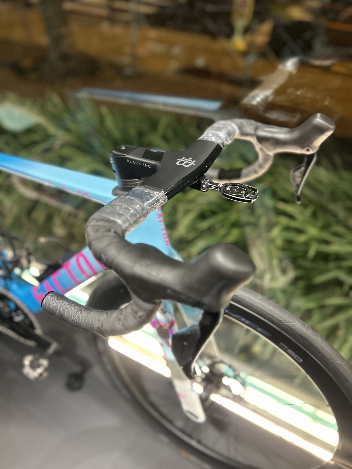 フレームセットに付属するハンドル、ステム一体型!空力的にデザインされているのはもちろんのこと、乗り心地を高めるためにバーエンドの剛性を高め、人間工学的にデザインされた角度、ドロップ、リーチによりトップは快適性と安全性のためにバーに手が届く形状なんです。専用のGARMINコンピュータマウント付属