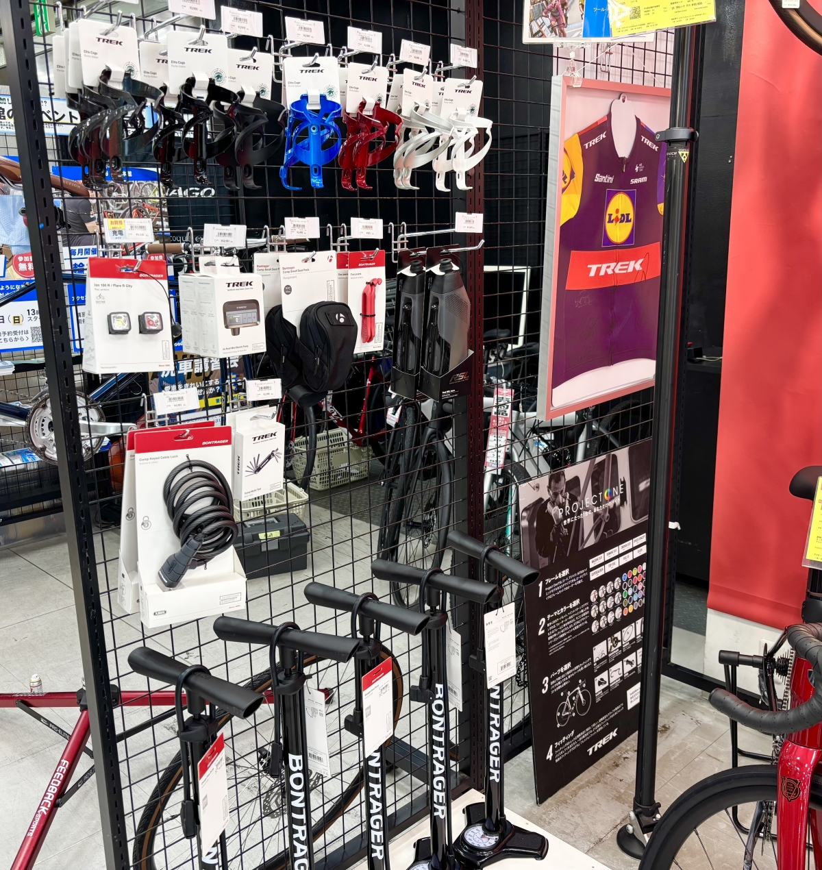 ワイズロード大阪本館でもトレックコーナーを充実させようと、オプションパーツを集めて車体と一緒にご覧いただけるようにいたしました!