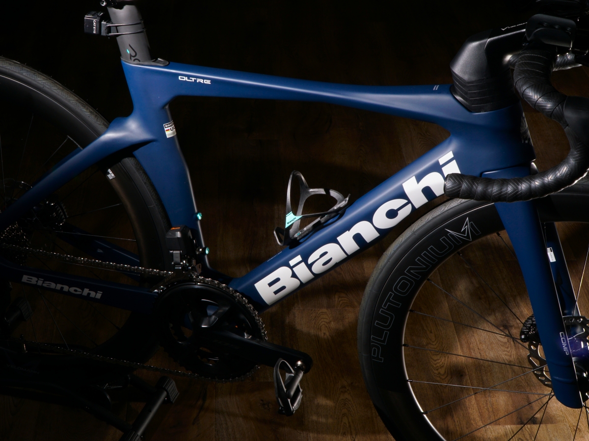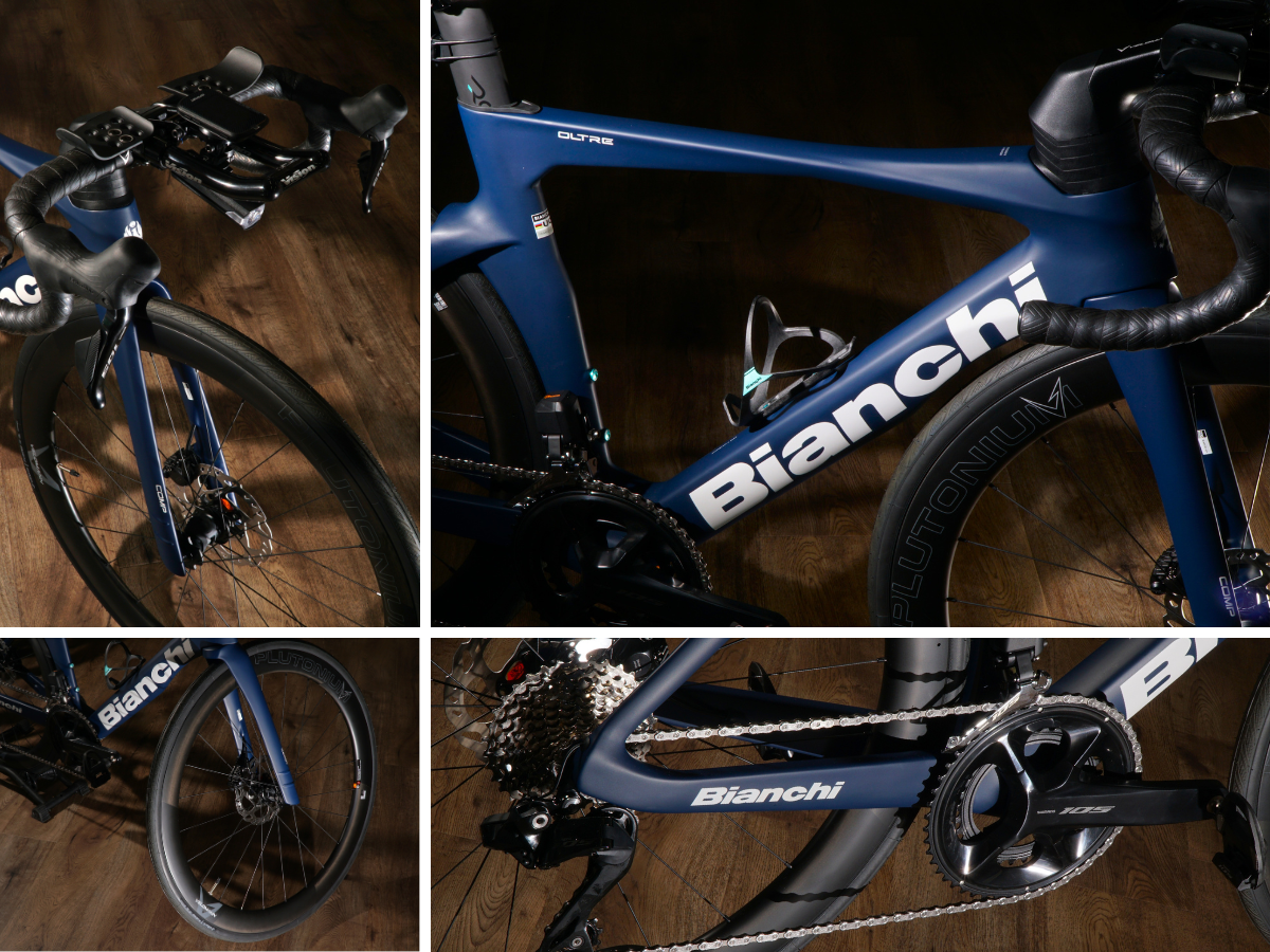 深みのある濃いブルーにより、ホワイトロゴが美しく映えるブルーグレー/ホワイトフルマットカラーをまとったエアロロードバイク『OLTRE COMP』です。