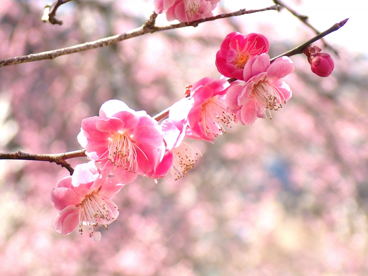 上段・中段・下段で三段になる小高い丘が梅林になっているので、引いて見ると山全体が梅で咲き乱れているように感じます。