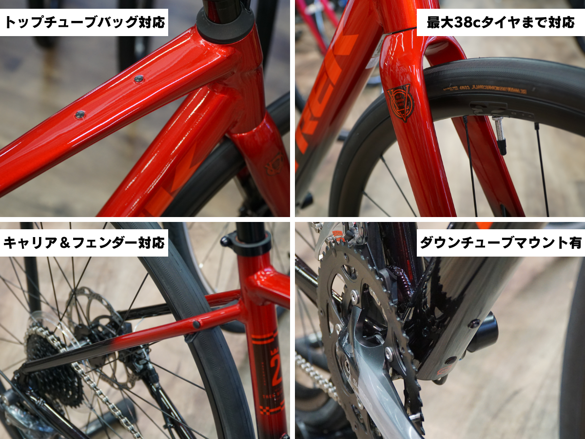 使用できるタイヤも最大で38cと従来のロードバイクでは考えられない対応幅、レースの為の競技機材でなく、多くの方が楽しめるスポーツニーズに特化したロードバイクとなっています。
