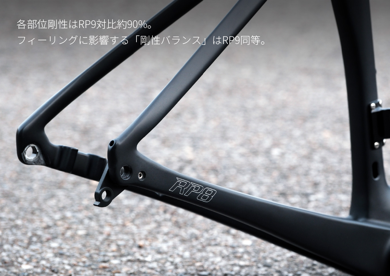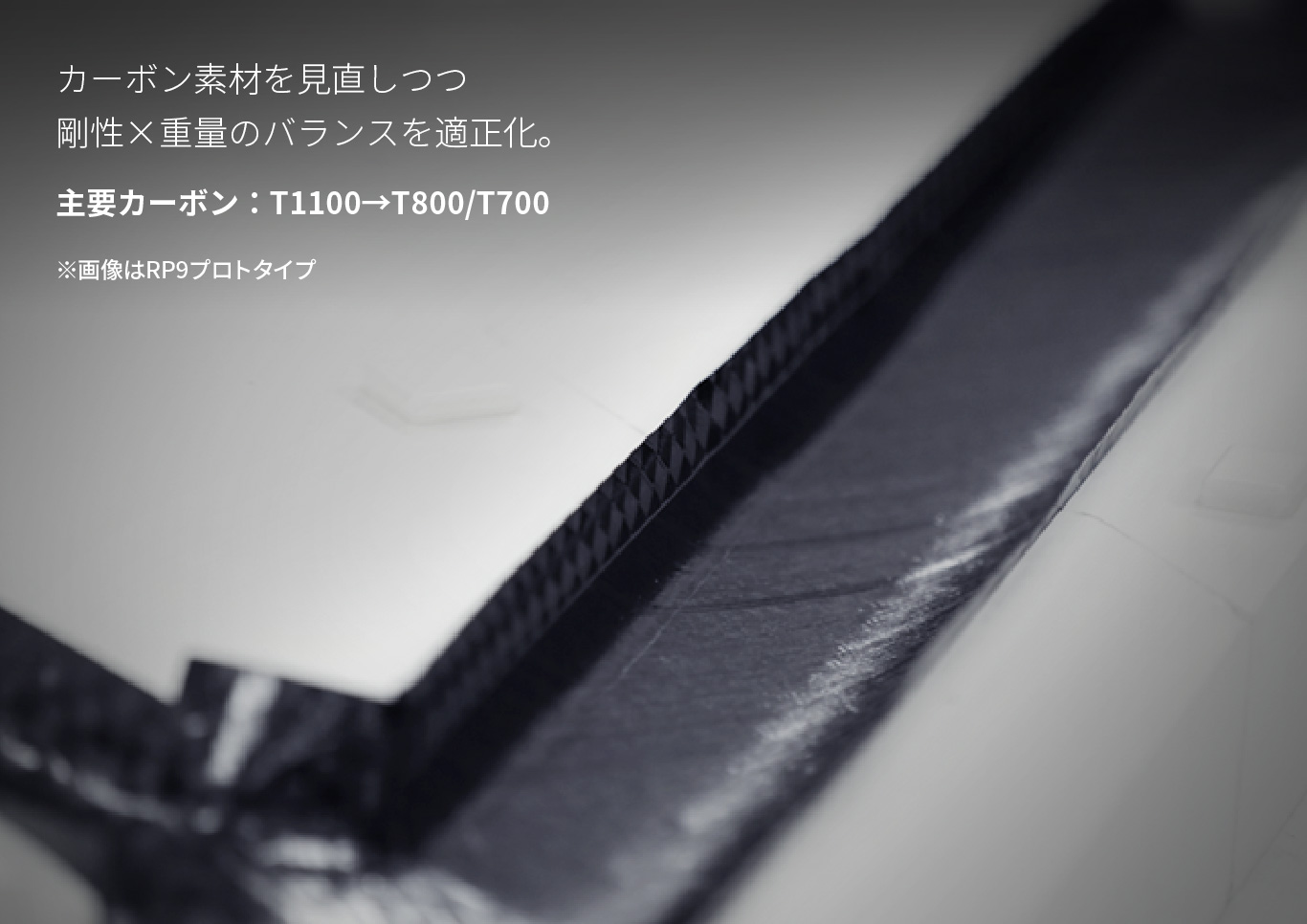 主要な部位の剛性はRP9対比で約90%としつつ、走行フィーリングを左右する剛性バランスはRP9同等に設定したことで、RP9譲りの乗り味を実現。