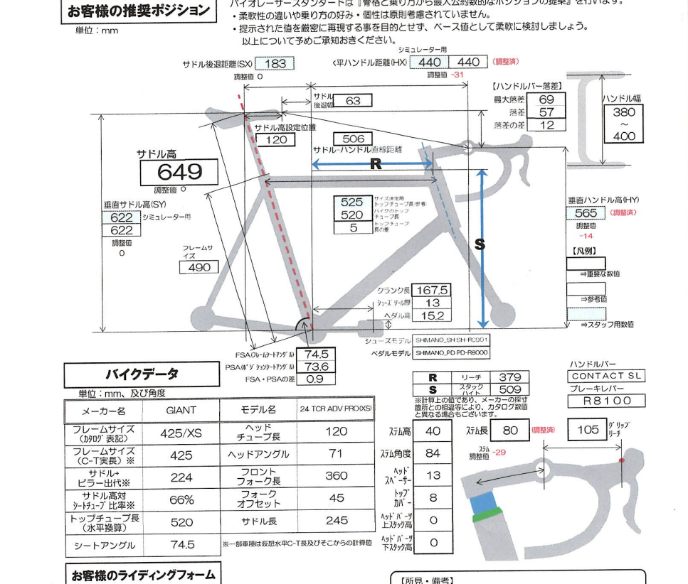 フィッティング結果からデータシートを作成し、実車に落し込んでいきます。まずは現在のポジションと比較し、どこをどのくらい調整する必要があるのかを確認します。私の場合はサドルが数ミリ上がり、かなり後ろになりました。その影響でステム長が110mmから80mmへ30mm程短くすることに。