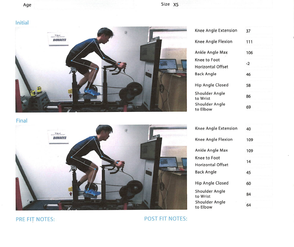 結果はこんな感じです。上の写真がBeforeで下がAfter。かなり自然なフォームになりましたね。各部の値も推奨値内に収まっています。実際このポジションで漕いでみると、今までよりも身体がラクになり、かつしっかり踏めている感じ。