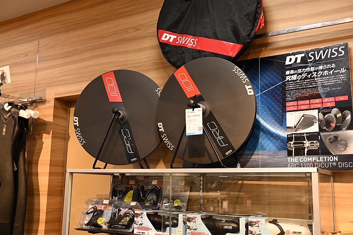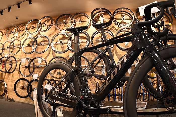壁一面に展示されるカーボンホイールはまさに圧巻!!