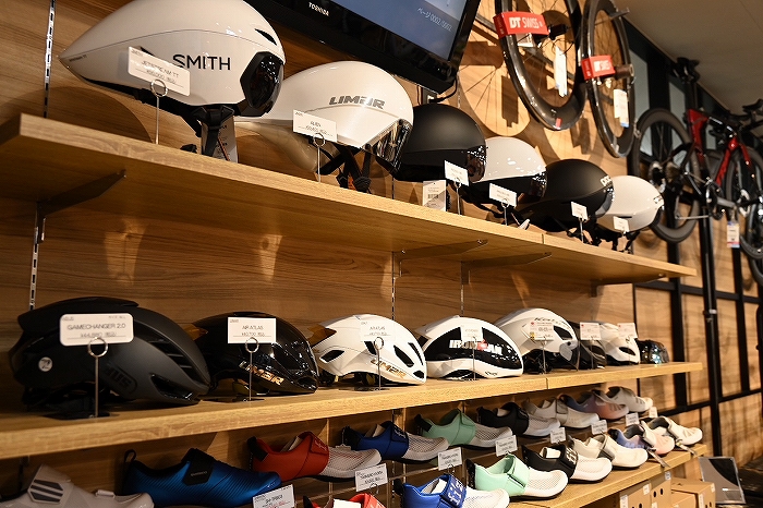 エアロヘルメットやトライアスロンシューズも多数展示。