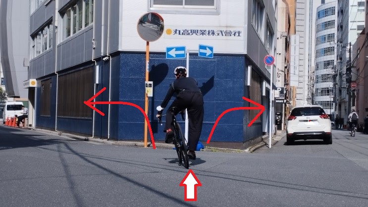 自転車を左側に傾けたまま①まっすぐ走る②右に曲がる③左に曲がる↓