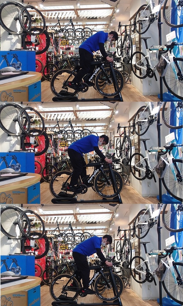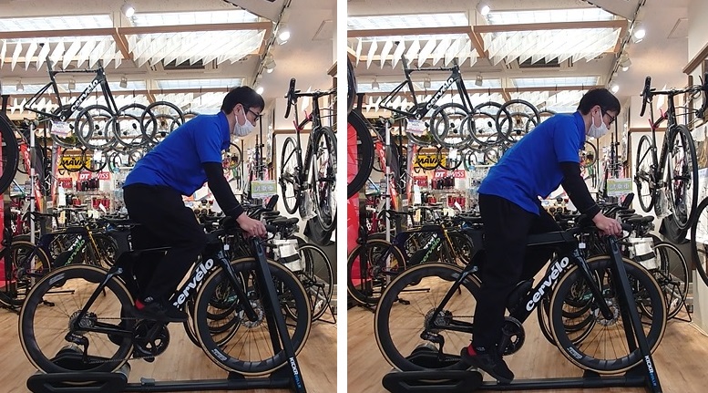強度によって若干前乗り気味になると、からだと自転車を連動させて力強いペダリングが出来ると思います。