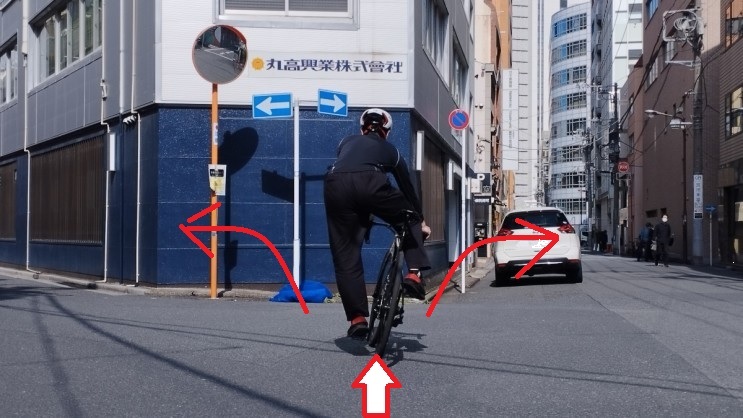 自転車を右側に傾けたまま①まっすぐ走る②右に曲がる③左に曲がる↓