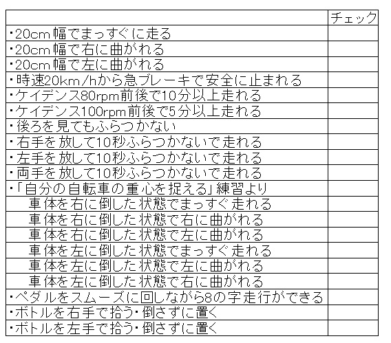 ふらつかないように片手を放して走行する放す時間を延ばす(10秒程度)反対の手も行えるようにする。