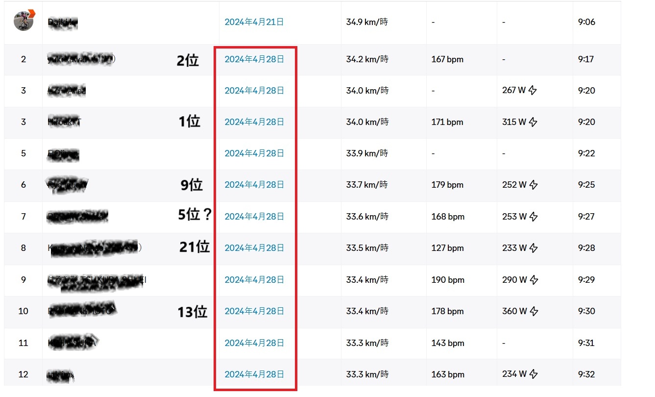 皆さん後半ほどかなりの高出力で踏んでいるのがわかりました。
