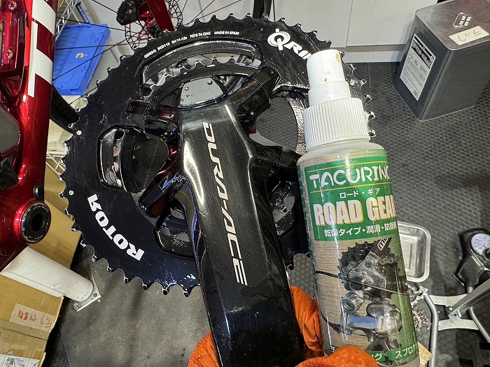 チェーンチングやスプロケットは掃除したうえで、駆動抵抗を減らす魔法のようなケミカル、タクリーノ ロードギアを塗りたくります。
