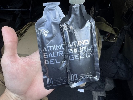 朝食は早めに済ませ、レース前にはここ数年レース前に必ず飲んでいるアミノサウルスのジェルを摂取。