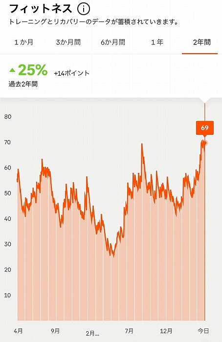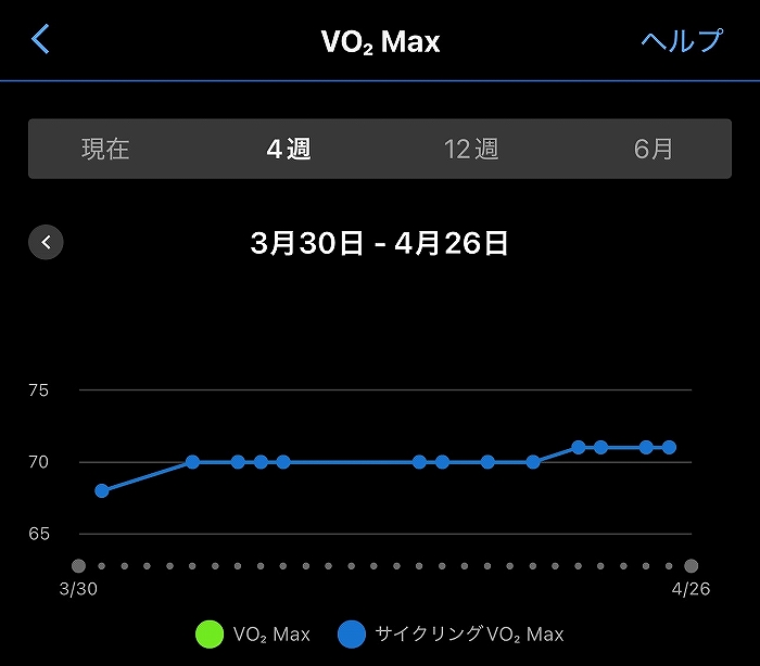 ずっと69~70を維持していたVo2MAX(心肺の強さ)は直前に71まで戻りました。