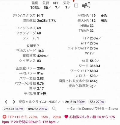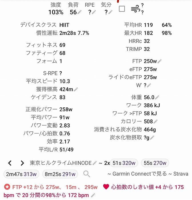 それを踏まえて、2~5分全力のインターバル、10分全力走、20分FTP走などの比較的短時間高負荷のメニューを中心に仕事前にローラー台で朝練。*実際にはほとんどできませんでした