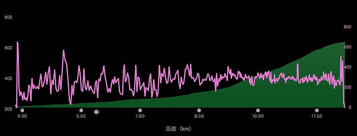 3kmくらいを過ぎるとだんだん勾配がきつくなっていき、5kmくらいから勾配が一気にきつくなります。