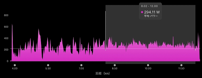 後半区間はFTPを大きく上回る294Wで踏んでいて、おおむね一定ペースで踏んでいますが終盤は少しパワーが下がってしまっています。