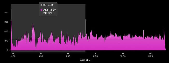 スタート直後の加速に750Wを出してしまっていますが、ついていくにはやむなし。