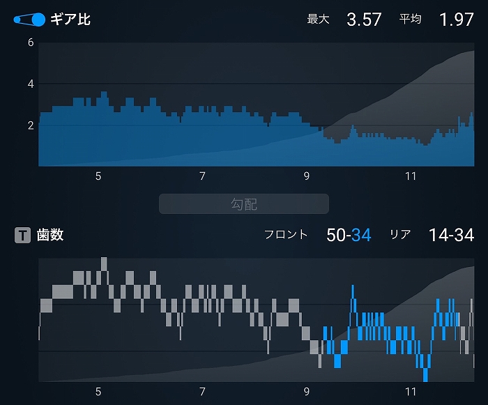 意外にもインナーロー(ギア比1)は中盤一度しか使っていなかったようです。