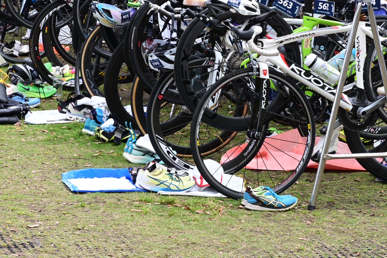 トランジッションエリアではすぐに着替えやシューズの交換ができるようにこのようにアイテムをキレイに並べておきます。