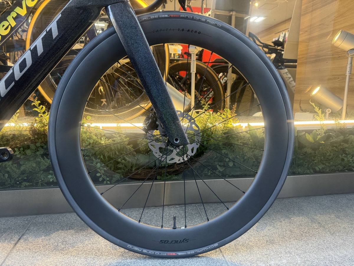 Syncros Capital 1.0 Aero 60mmというカーボンホイールが標準装備です!最初から60mmハイトのボリューミーなホイールが付いているのはまさにトライアスロン用におあつらえ向きと言えるでしょう。