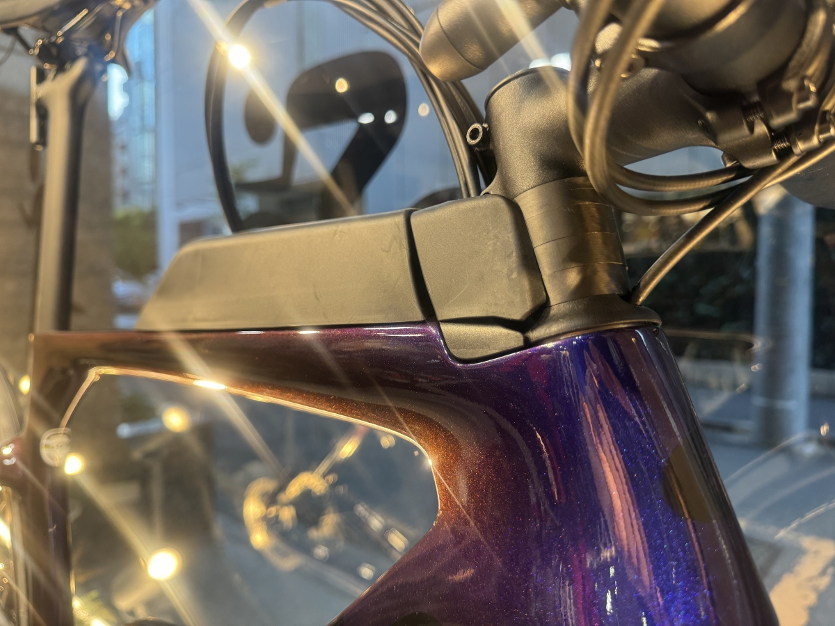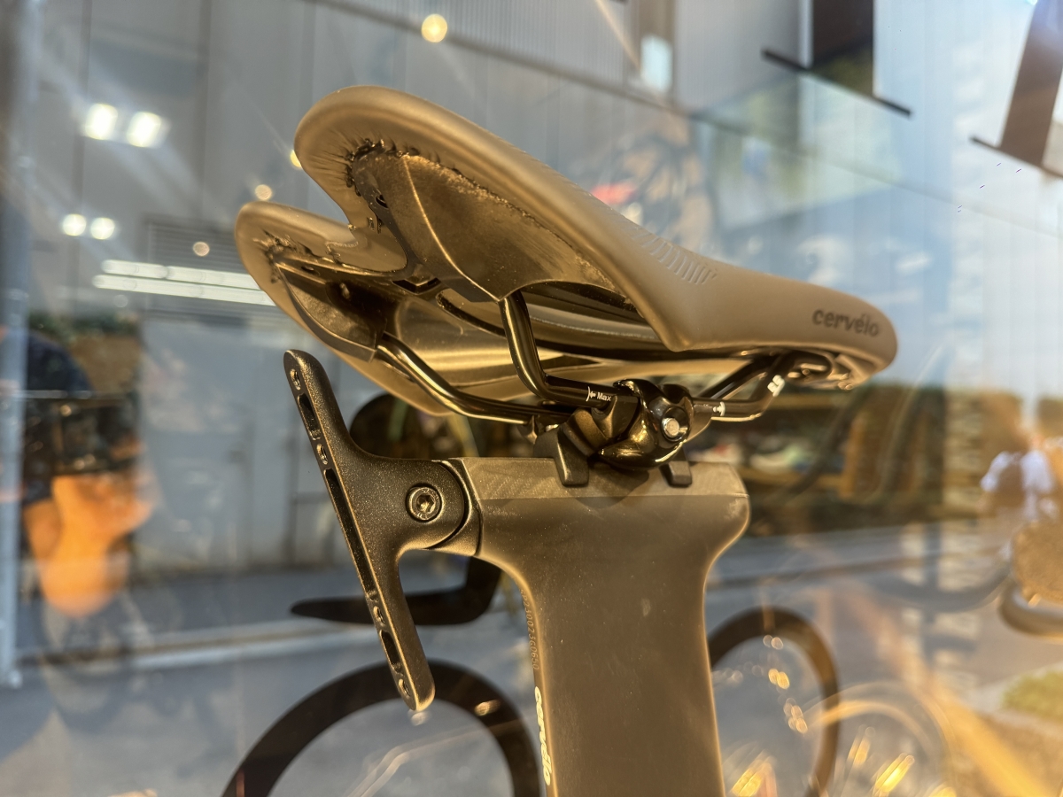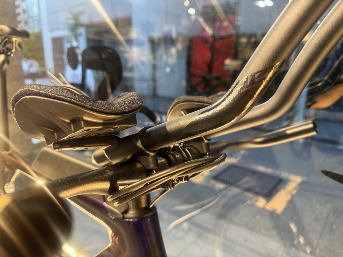 エアロ形状のシートポストにもボトルケージを取り付けられる台座が標準で付いています。これからの時期、水分補給はとても大切なのでこちらにも取付するのがオススメ◎ サドル位置自体も前後にかなり調整が可能ですので前乗りなど様々対応可能です。