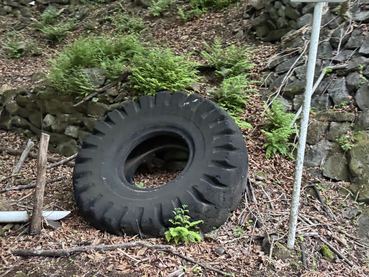 上り坂に沿って石垣や巨大なタイヤなど操業時の面影が色濃く残っていました。