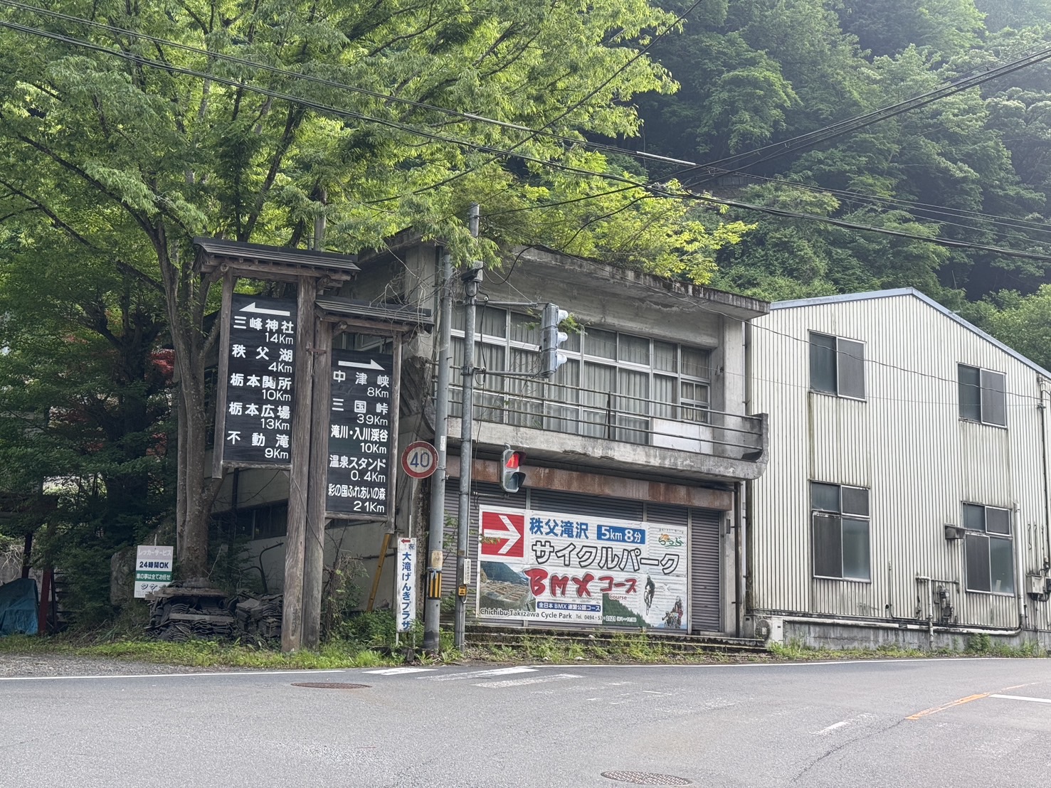 道沿いに古い建物が続きますが、人がいる建物や稼働する自販機もあり、完全な廃墟というわけではないようです。