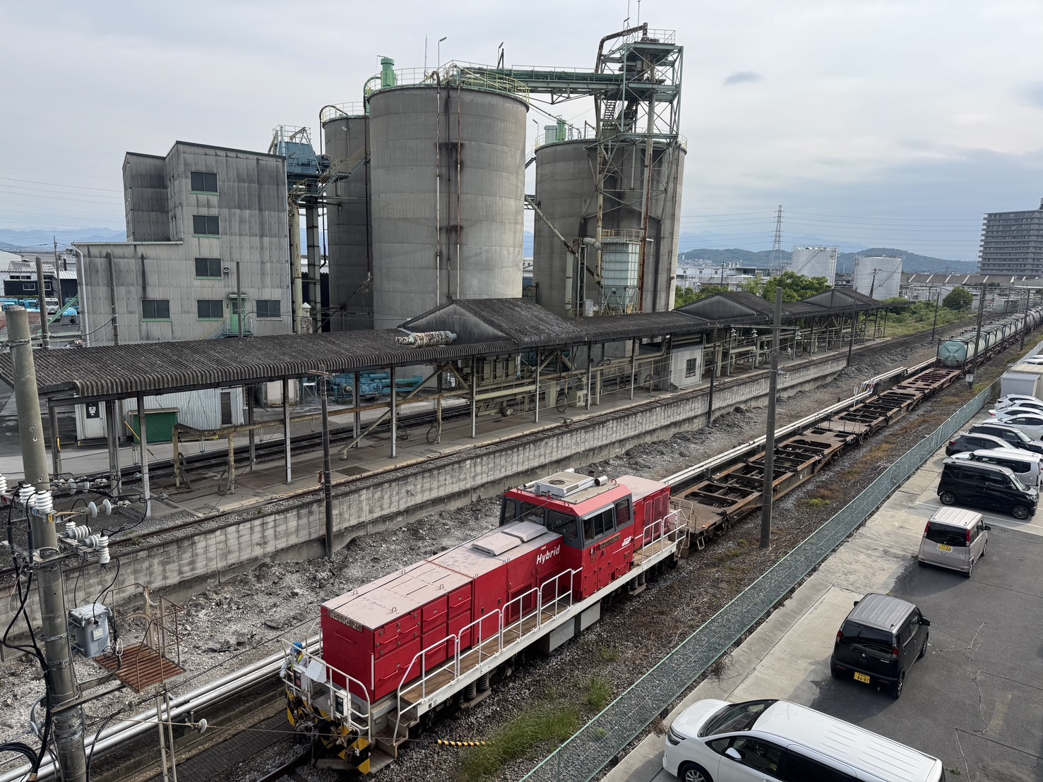 貨物用のホームの横を機関車がゆっくり通過していきます。