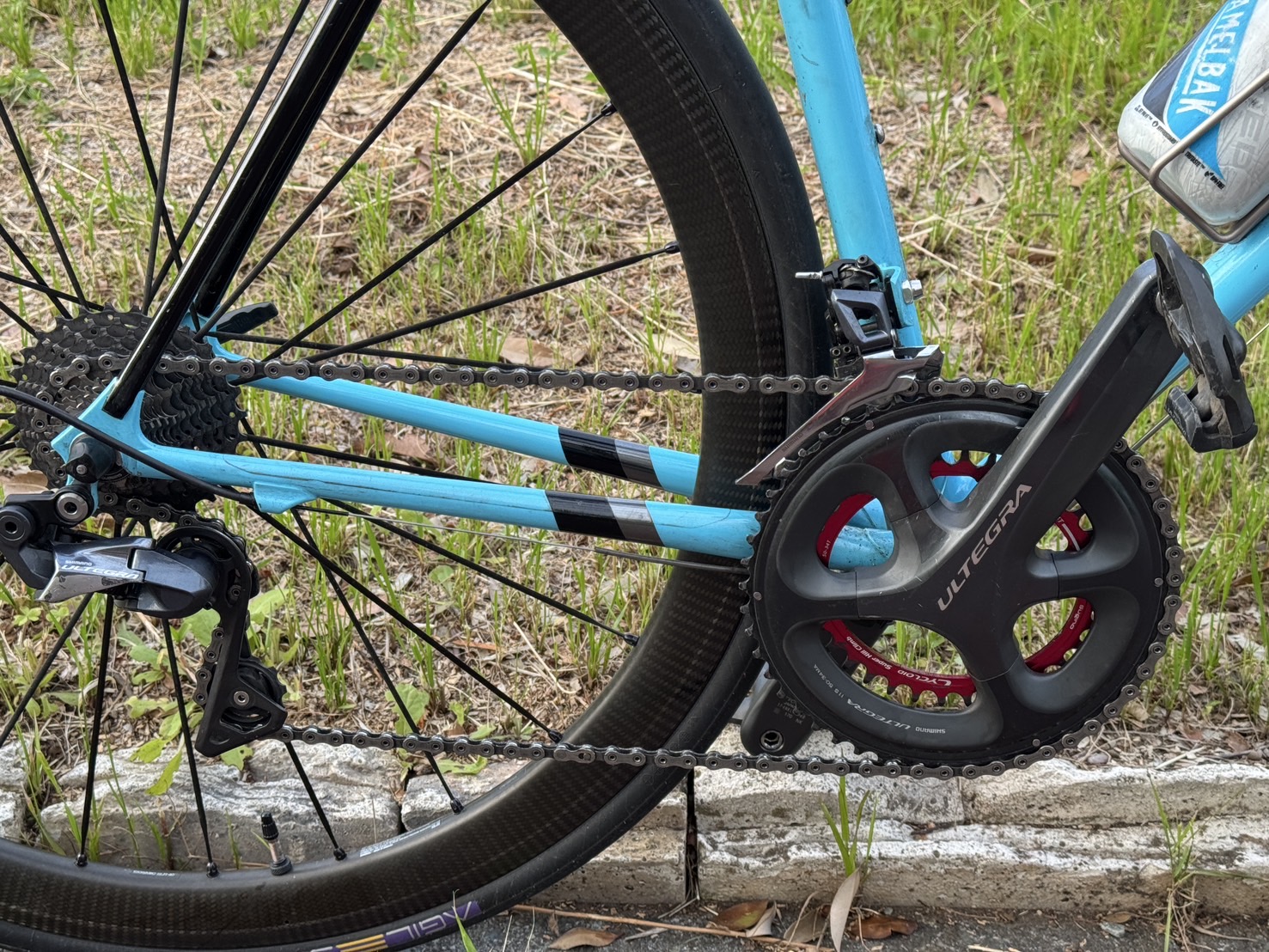 コンポは11sアルテグラ。インナーチェーンリングは楕円でヒルクライムでも効率よくペダリングできるようになっています。