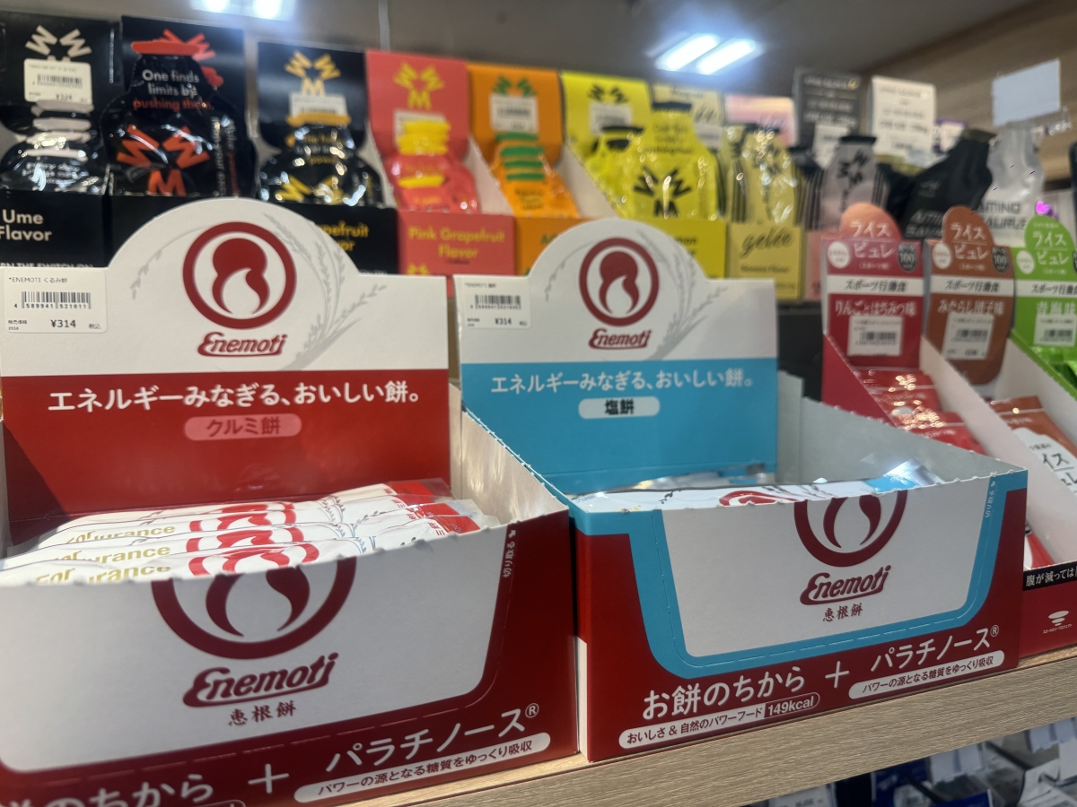 コチラはエネモチ!固形なので走りながらは食べにくいかもしれませんが、カロリーや糖質などのエネルギーを身体の負担にならないようゆっくりと吸収してくれるのでレース前に食べるといいかもしれません。