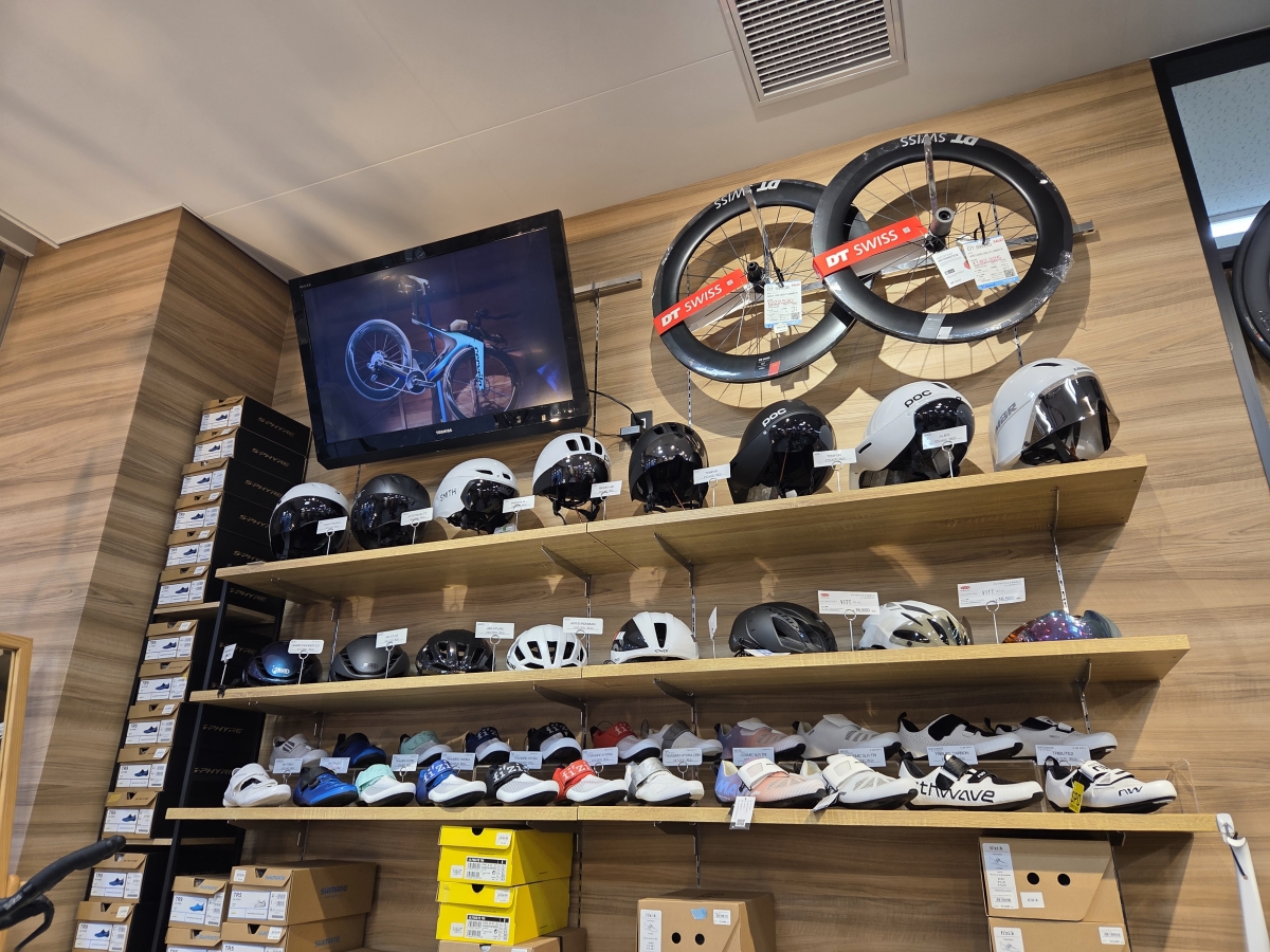 トライアスロン用のシューズ、ヘルメットも豊富な在庫数。
