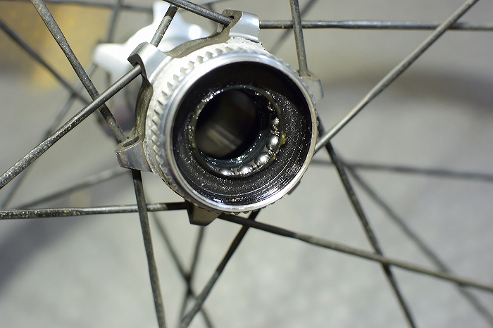 このように、玉が直接見えるのは「カップアンドコーン式」のベアリングで、シマノやカンパ系のホイールによく採用されています。