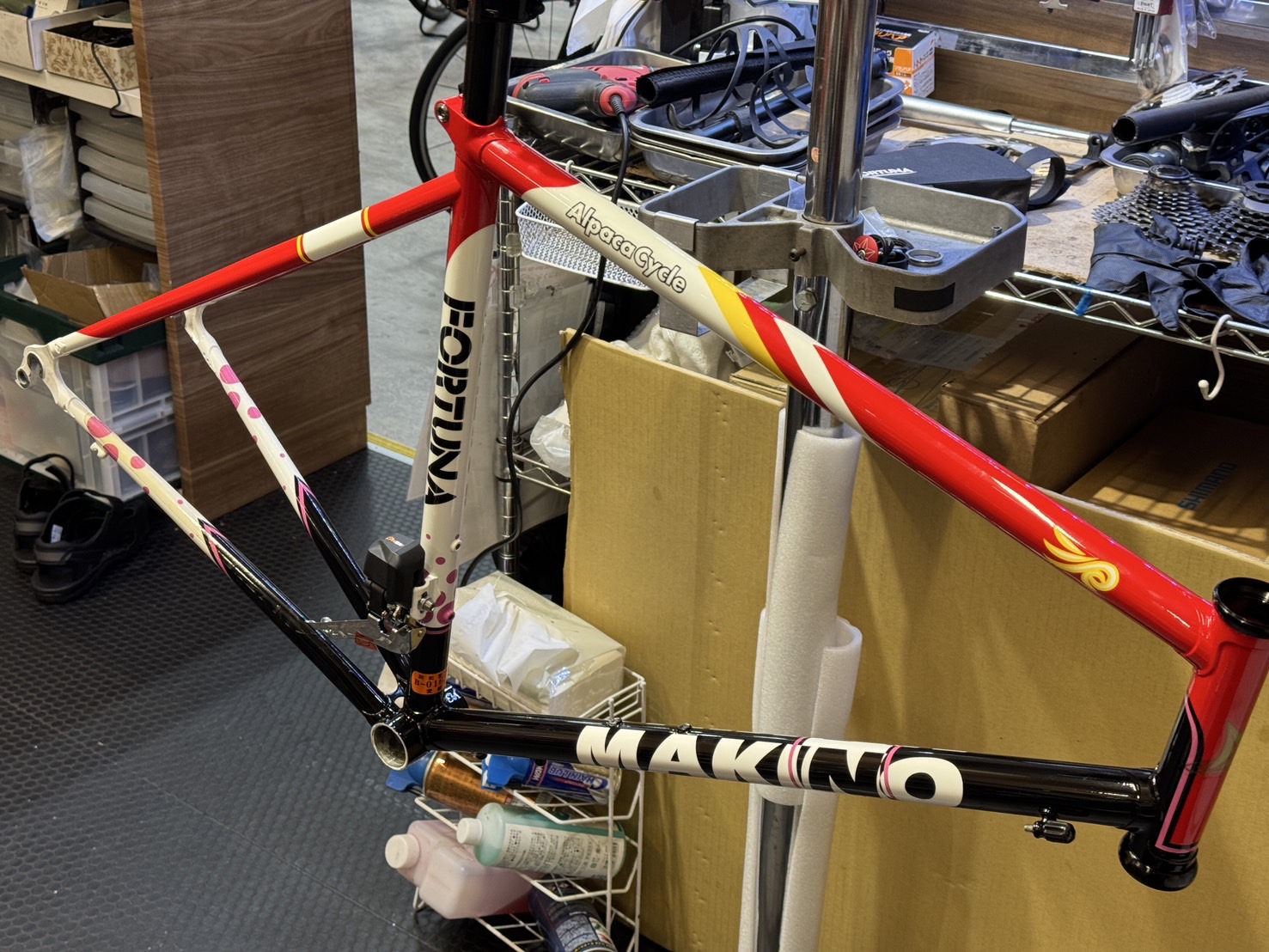 今回作業させていただいたのはMAKINOのクロモリフレーム。ろんぐらいだぁす! カラー!!