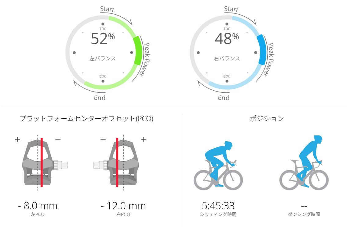 その他、画面左下はペダルのどの位置を踏んでいるか、右下はダンシングとシッティングの比率を教えてくれます。