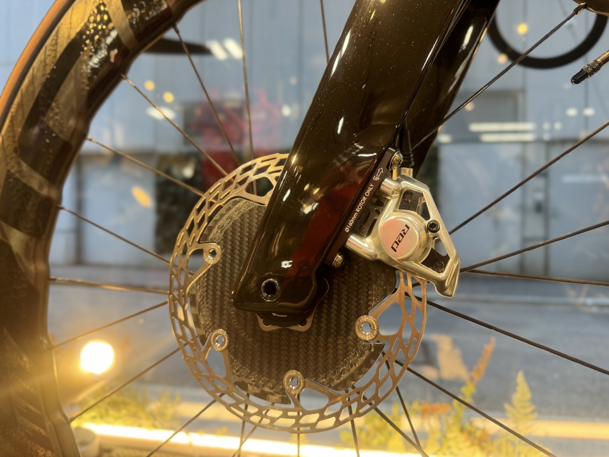 REDのブレーキキャリパーは軽量化等のための肉抜きが激しく、メカメカしい見た目が最高にカッコいいです!
