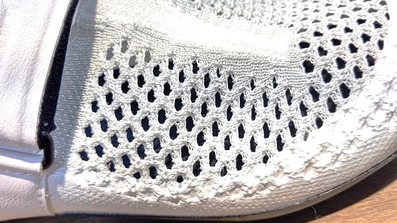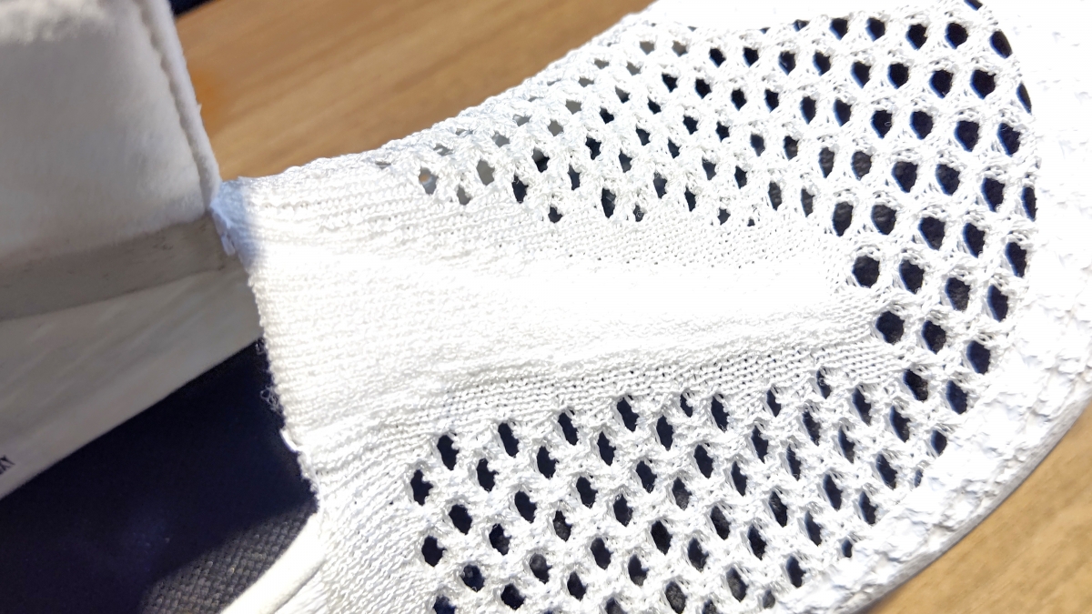 足を入れてみたところ、母指球などの圧迫感は生地の兼ね合いもありかなり少なく履きやすいモデルでした。