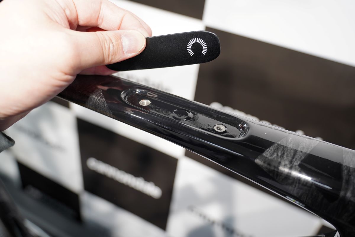 先代のSUPERSIX EVO CX/SEでは、ダウンチューブ上面とシートチューブのボトルケージ台座以外にオプションを取り付けるマウントはありませんでした。シクロクロスバイクとしては十分でしたが、グラベルロードとしては少し足りない。そこでトップチューブマウントが用意されています。使用しない時にはボルト止めのカバーで隠すことができます(写真はサンプルバイクのため一部仕様変更予定)。