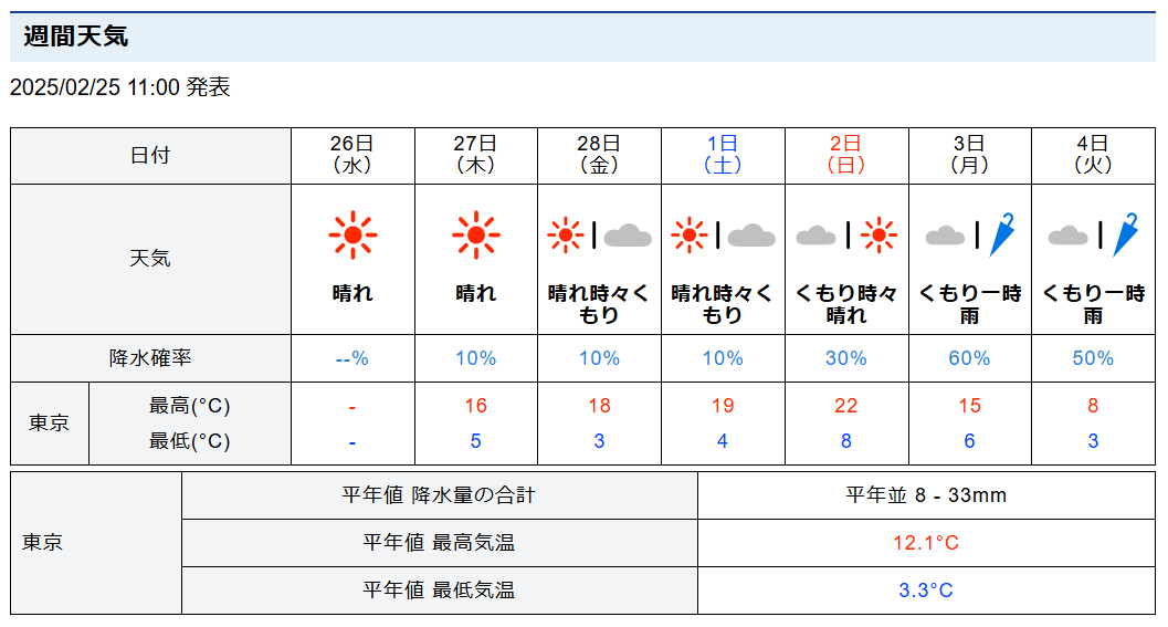 このブログを書いている2/25当日の東京の気温変化は、最低気温 2℃~最高気温 12℃。