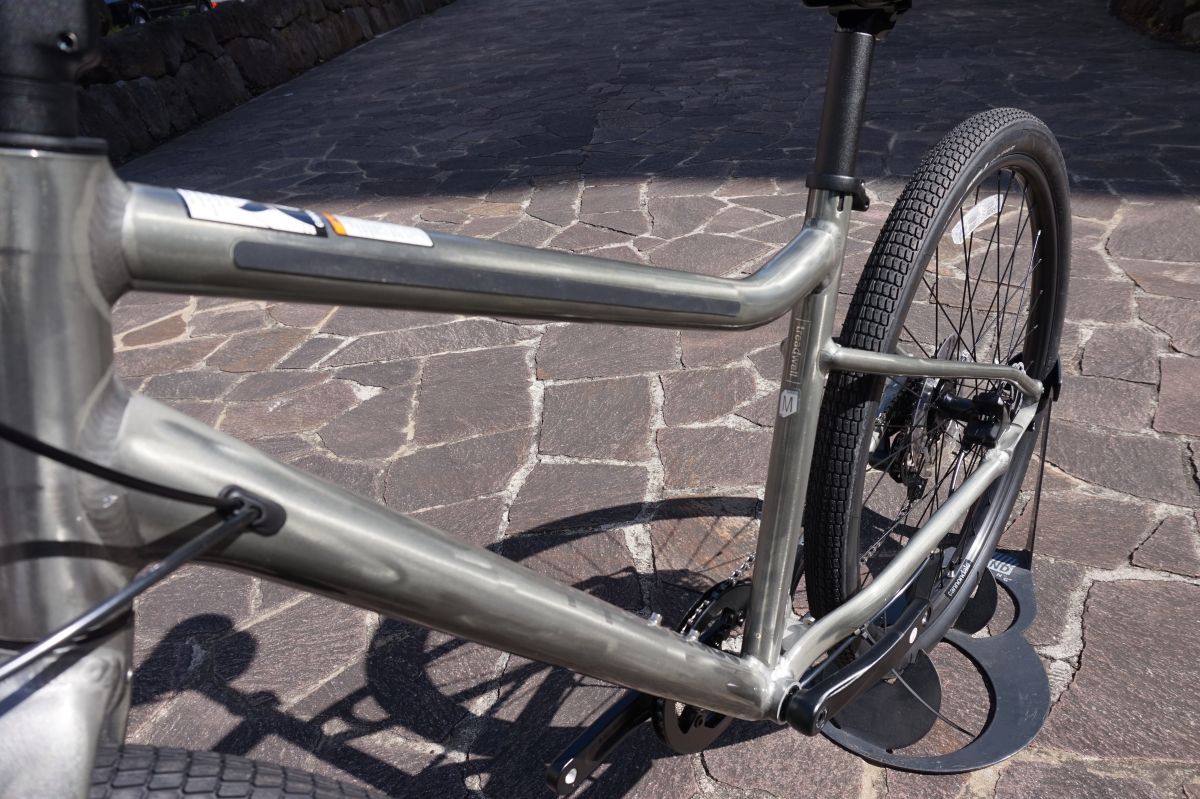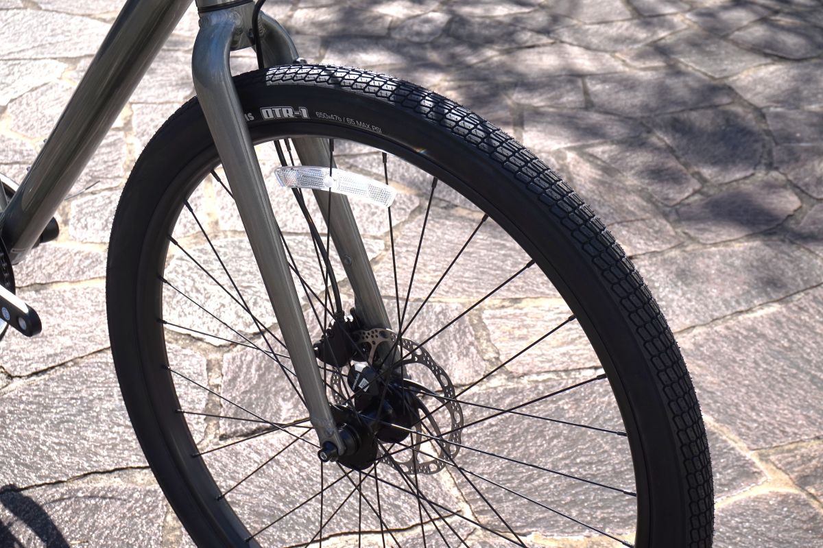 特徴その2は、この極太タイヤ。安定感がよく安心して走れます。このタイヤは昔のオートバイのものをインスパイアされたそうです。特殊っぽく見えますが市販されているタイヤなので、摩耗時も心配ありません。