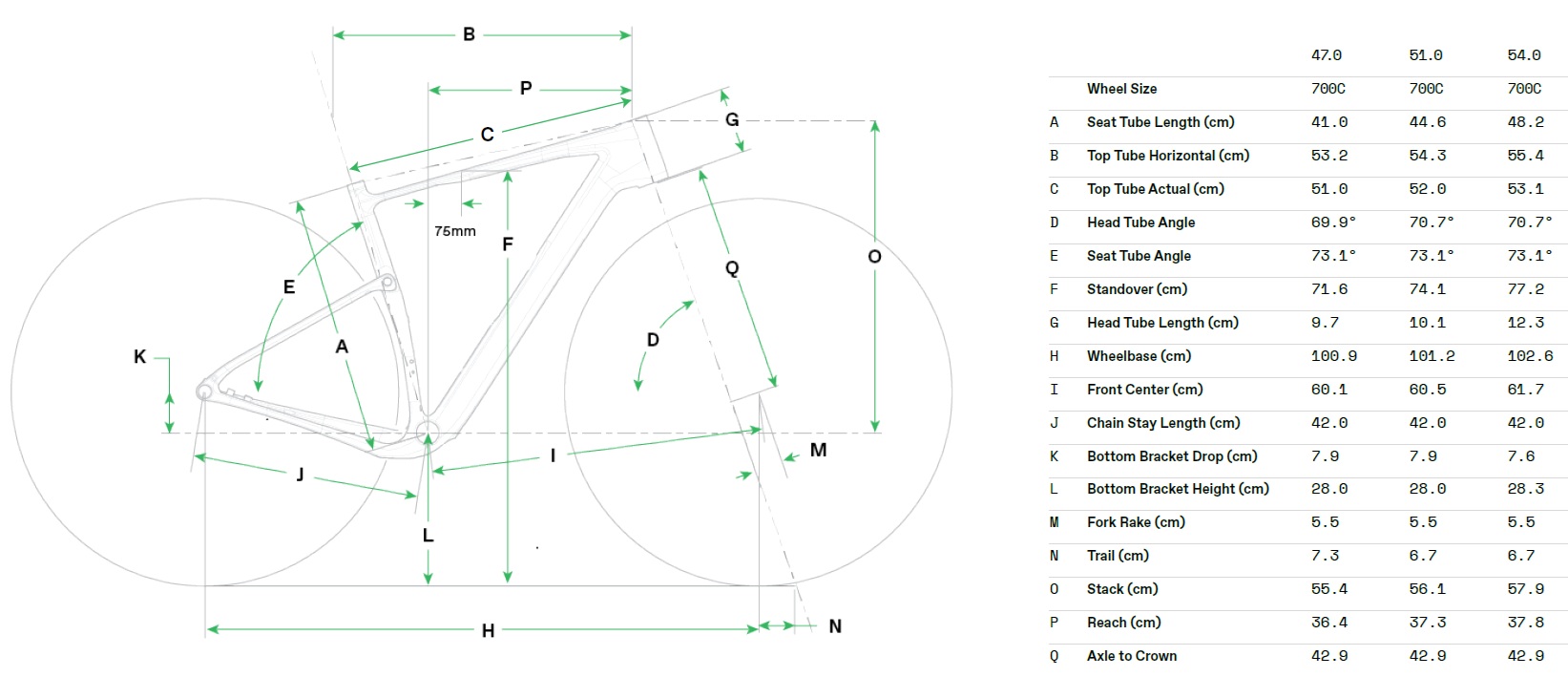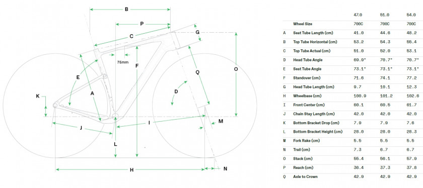 先代TOPSTONE CARBONまでは『XS、S、M、L』というサイズ表記での展開でしたが、第3世代からは『47、51、54』といった、ロードバイク系統同様の数字表記になりました。旧来のサイズと比較すると各数字が調整されていますが、ほぼ47=XS、51=S、54=Mでした。