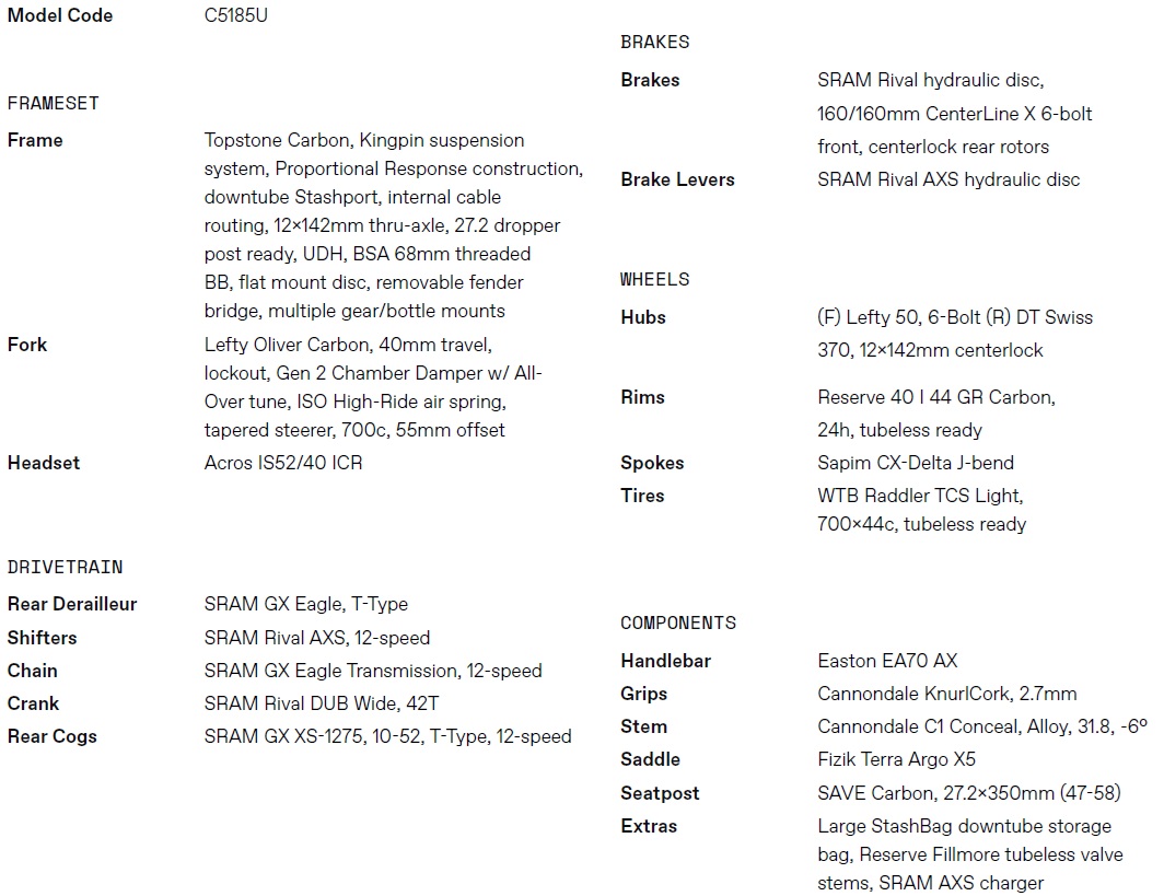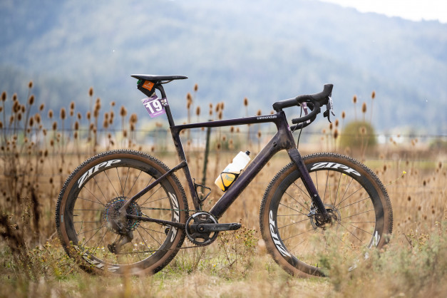 新型になったカーボンスリーブのLefty Oliverを装備し、ギア構成はリア12速ながら操作系がSRAM RIVAL AXS、リアディレーラーはMTB系のGX EAGLEをダイレクトマウントしたアドベンチャー仕様。ギアはフロント42T、リア10-52Tで最大ギア比は0.8。ホイールはReserveのカーボンリムにフロントはLefty50ハブ、リアはDT370。