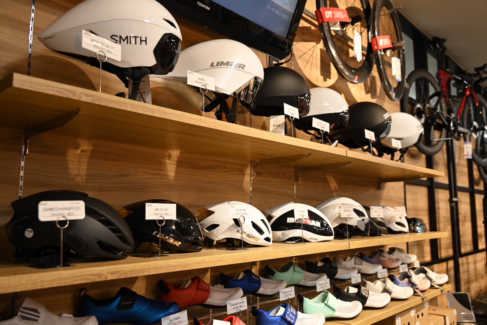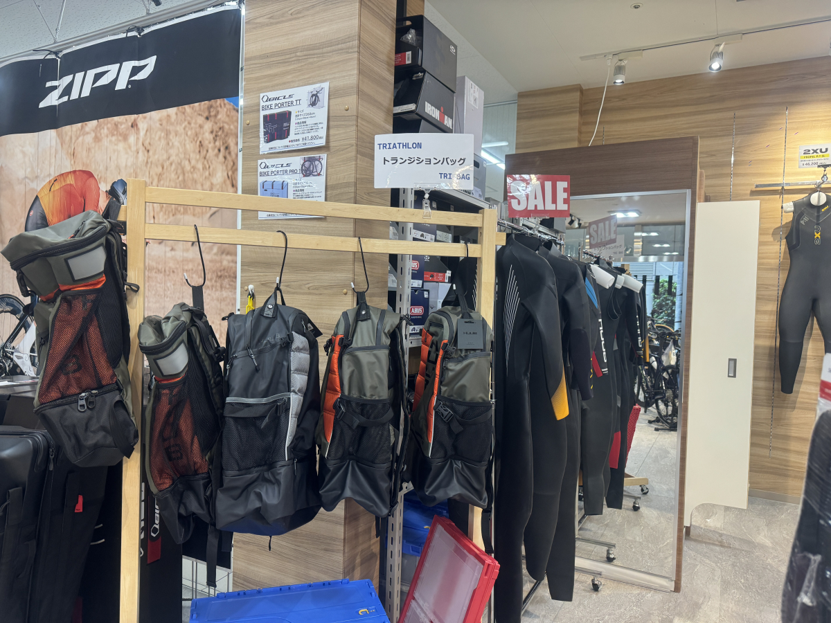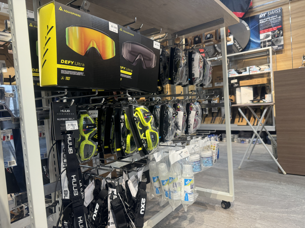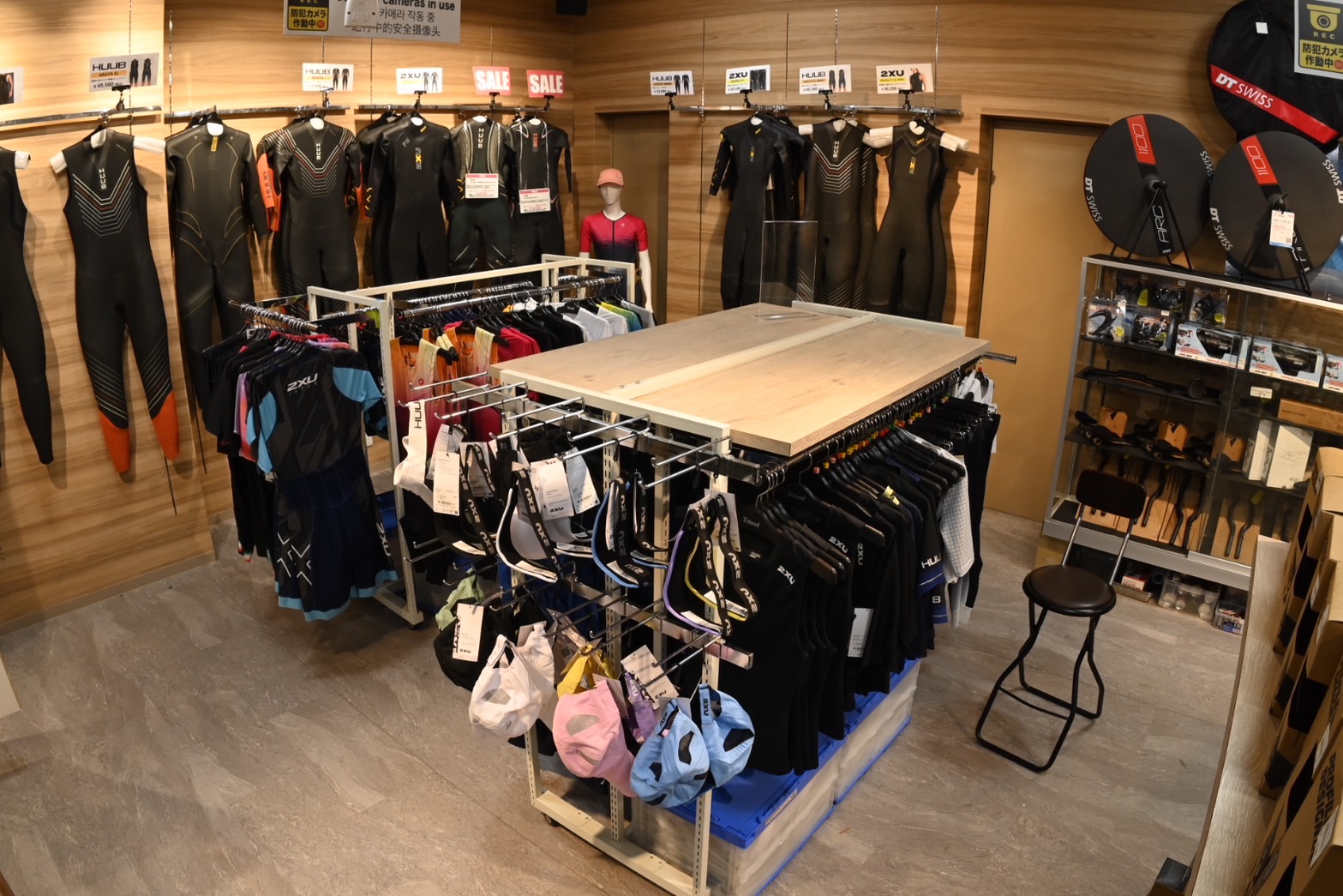 こちらはトライアスロン用のバイクやウェットスーツなどのウェア、細かいパーツアクセサリーを揃えたフロアとなっています!
