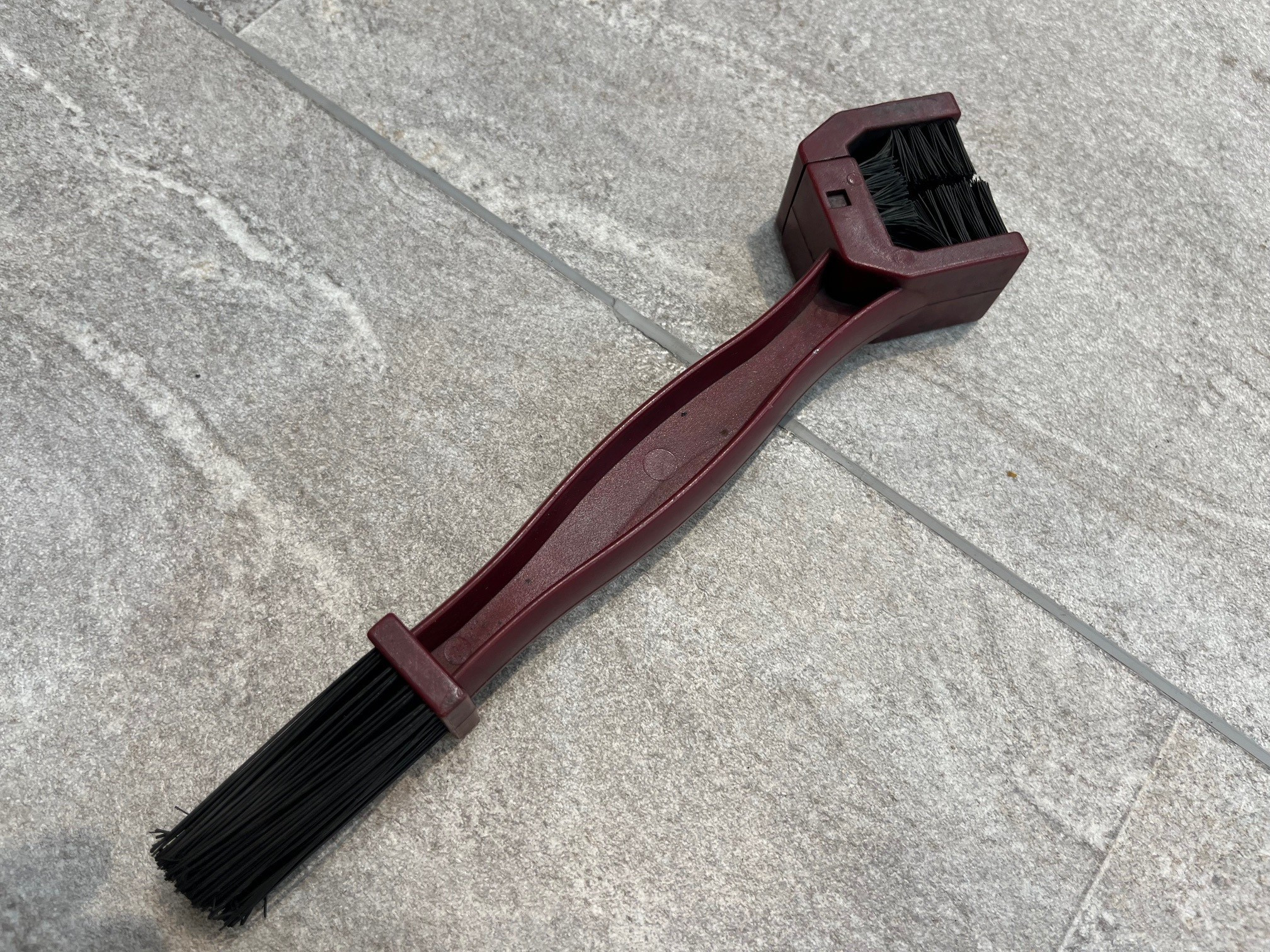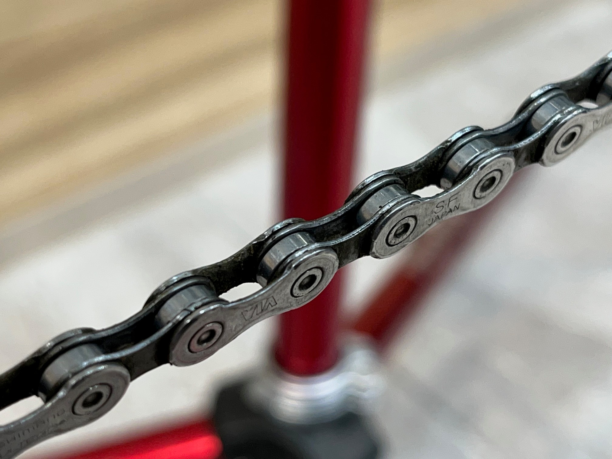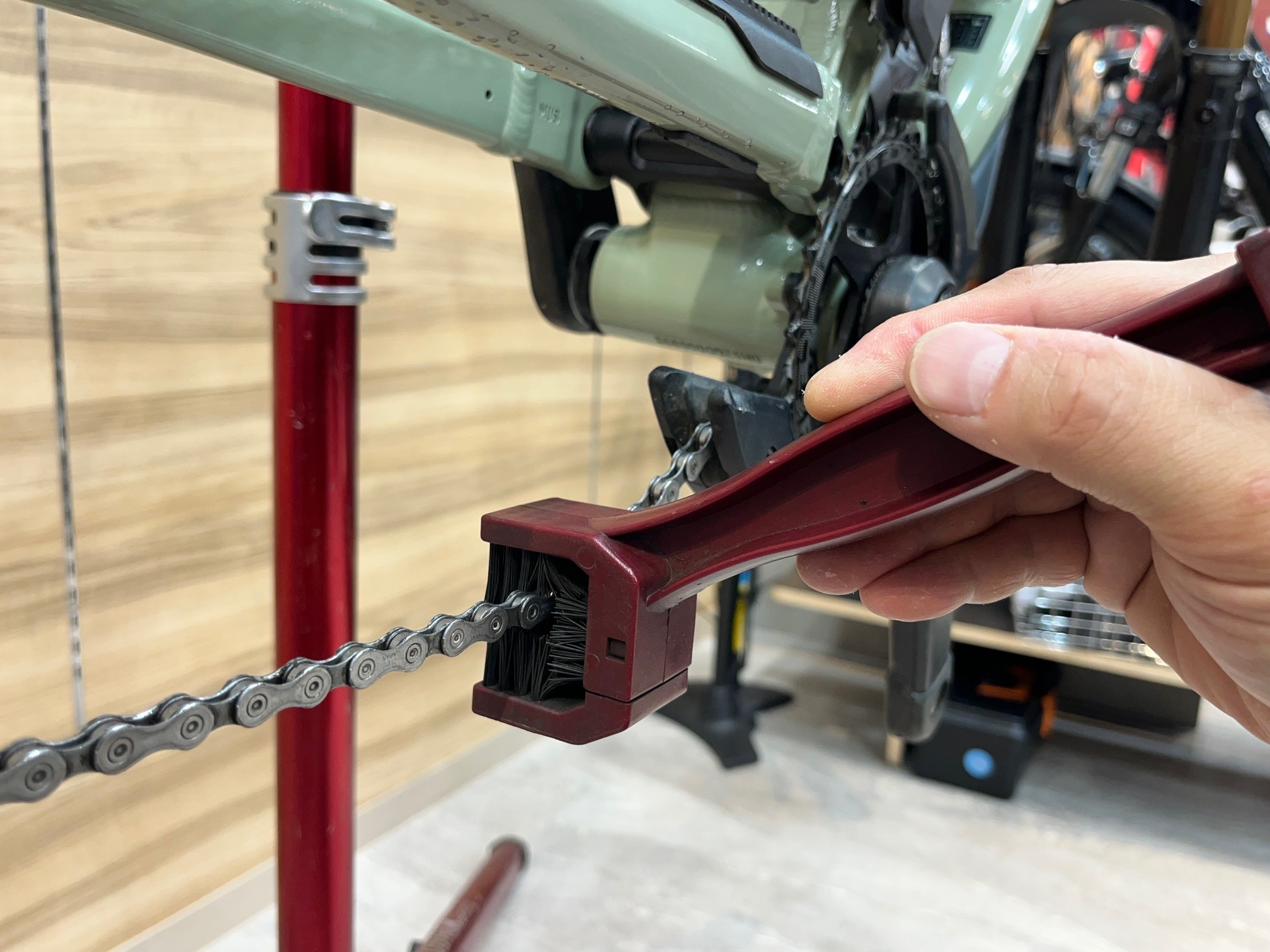 チェーンを綺麗にブラッシングするコツは、少しチェーンを下にブラシで押さえつけて、チェーンのローラーを回しながらブラシすると、中まできれいになります。