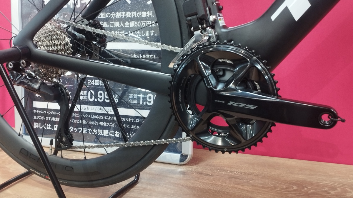 12sのシマノ105Di2。素早く正確なシフティングを可能にしています。一度Di2を触ってしまうともうワイヤー式には戻れない?!