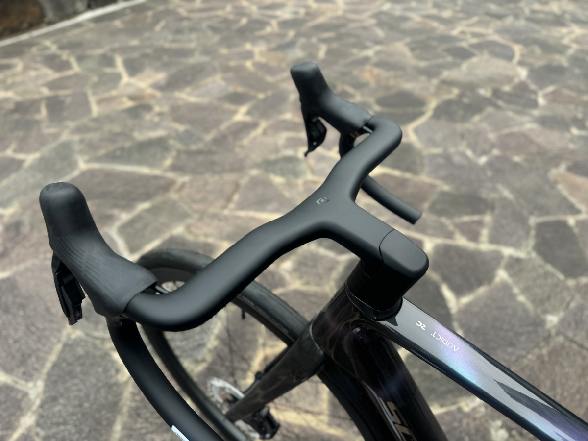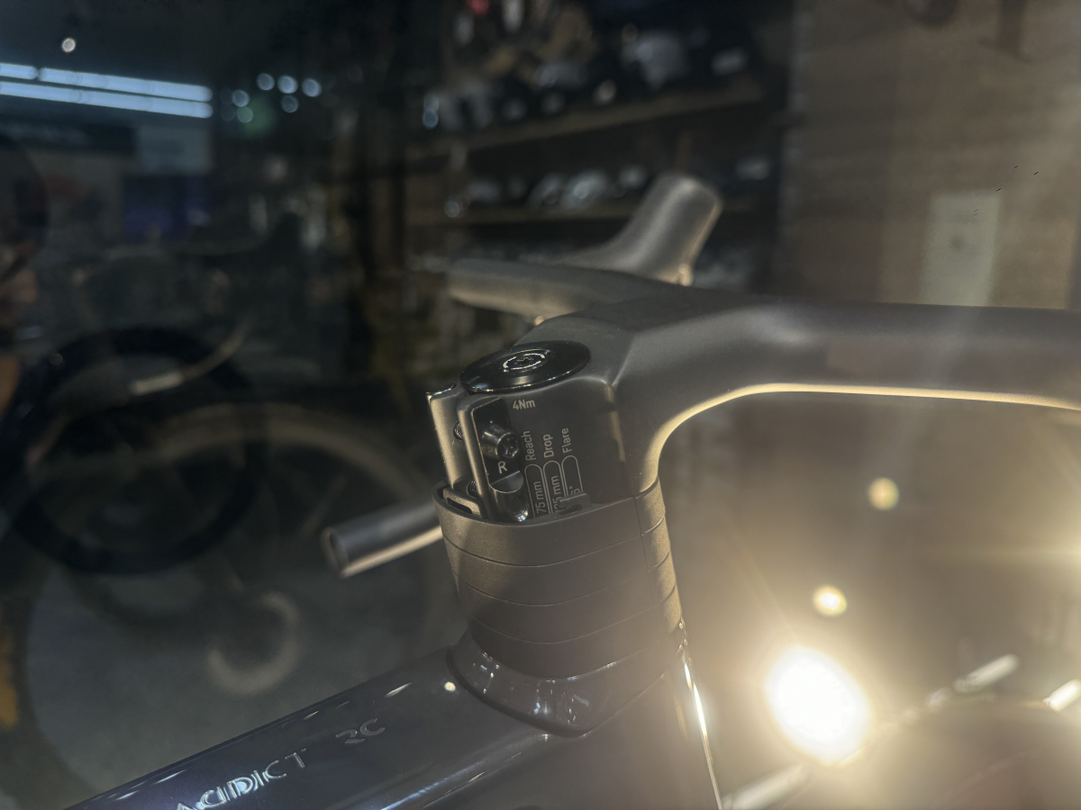 ちなみにこのフォークですが、ブレードからコラム部分まで完全一体成型のワンピース構造になっています。通常フォークはコラム部分やブレード部分などいくつかに分かれた物を接合して作るのですがADDICTはカーボン繊維の流れを断ち切ることなく一体で成型することにより軽量かつ高い剛性を実現しています。ただの軽量なヒルクライムバイクというよりかは全てを高いパフォーマンスで行える超軽量オールラウンドバイクといったところでしょうか。