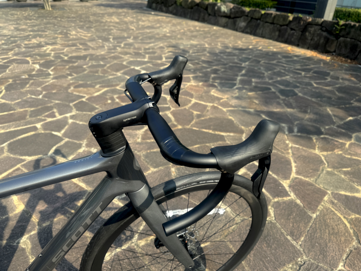 ハンドル、シートポストは最初からカーボン製のものを装備しています。
