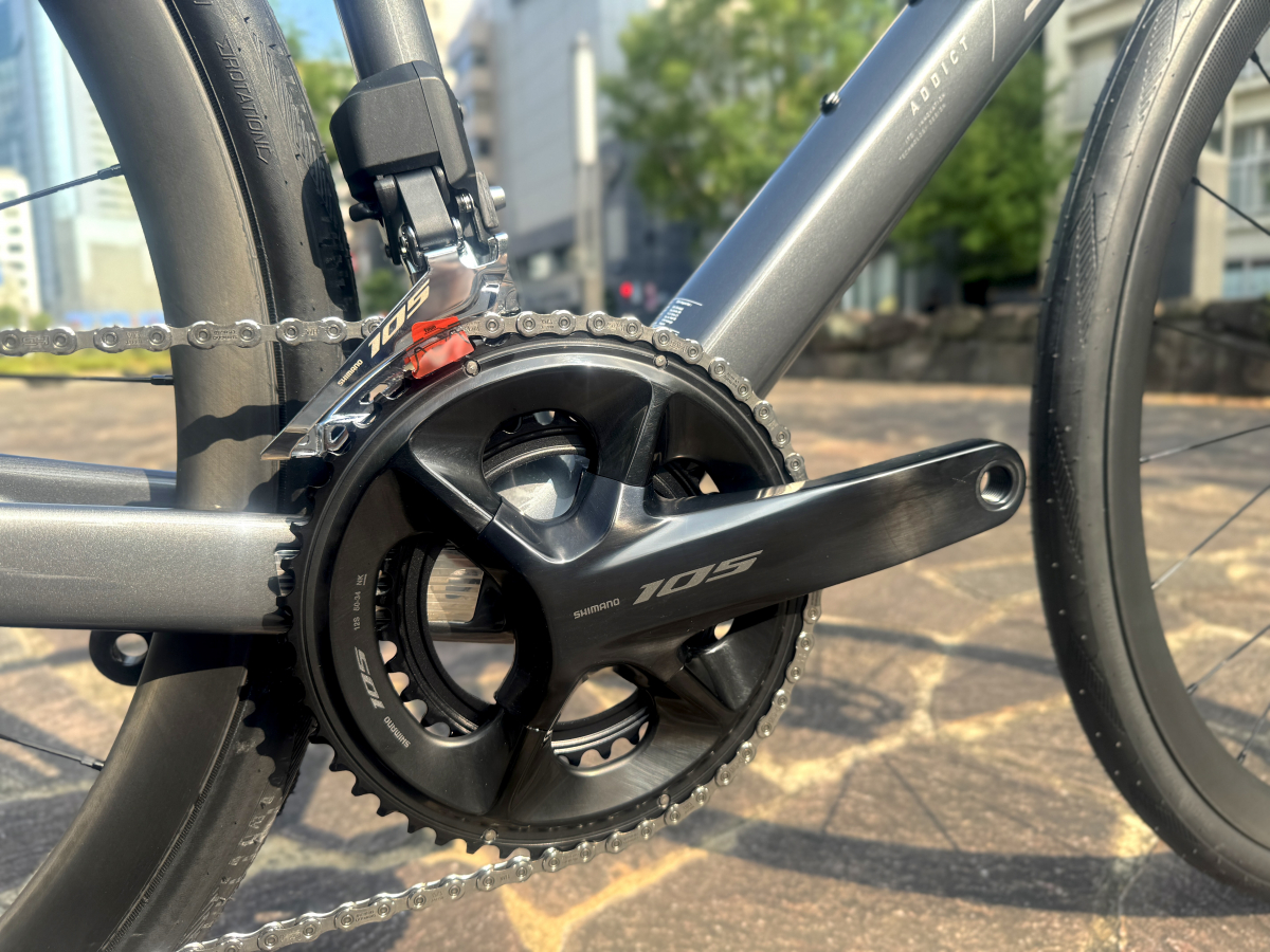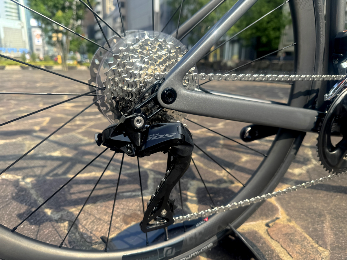 コンポーネントはコストパフォーマンスが非常に優秀な105DI2を搭載。上位モデルと同じ12段変速で、普通に使う分には申し分ない変速性能となっています。軽量化や余程レースユースでない限りは特にアップグレードは不要かと思います。