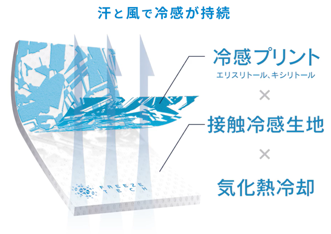 接触冷感の生地に冷感プリント(エリスリトール・キシリトールを使用)を施すことで、気化熱・接触・プリントによる3つの冷感効果を発揮します。