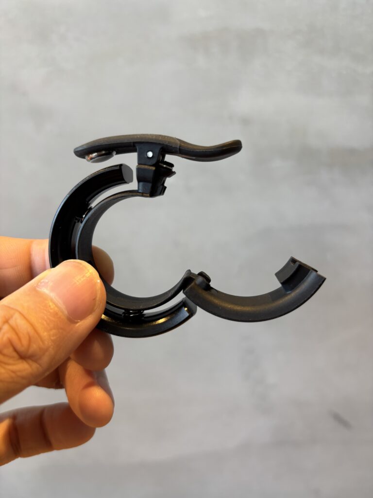 新設されたヒンジにより、マウント部が大きく開くようになったので、ハンドルバーへの取り付けがより簡単になりました。
